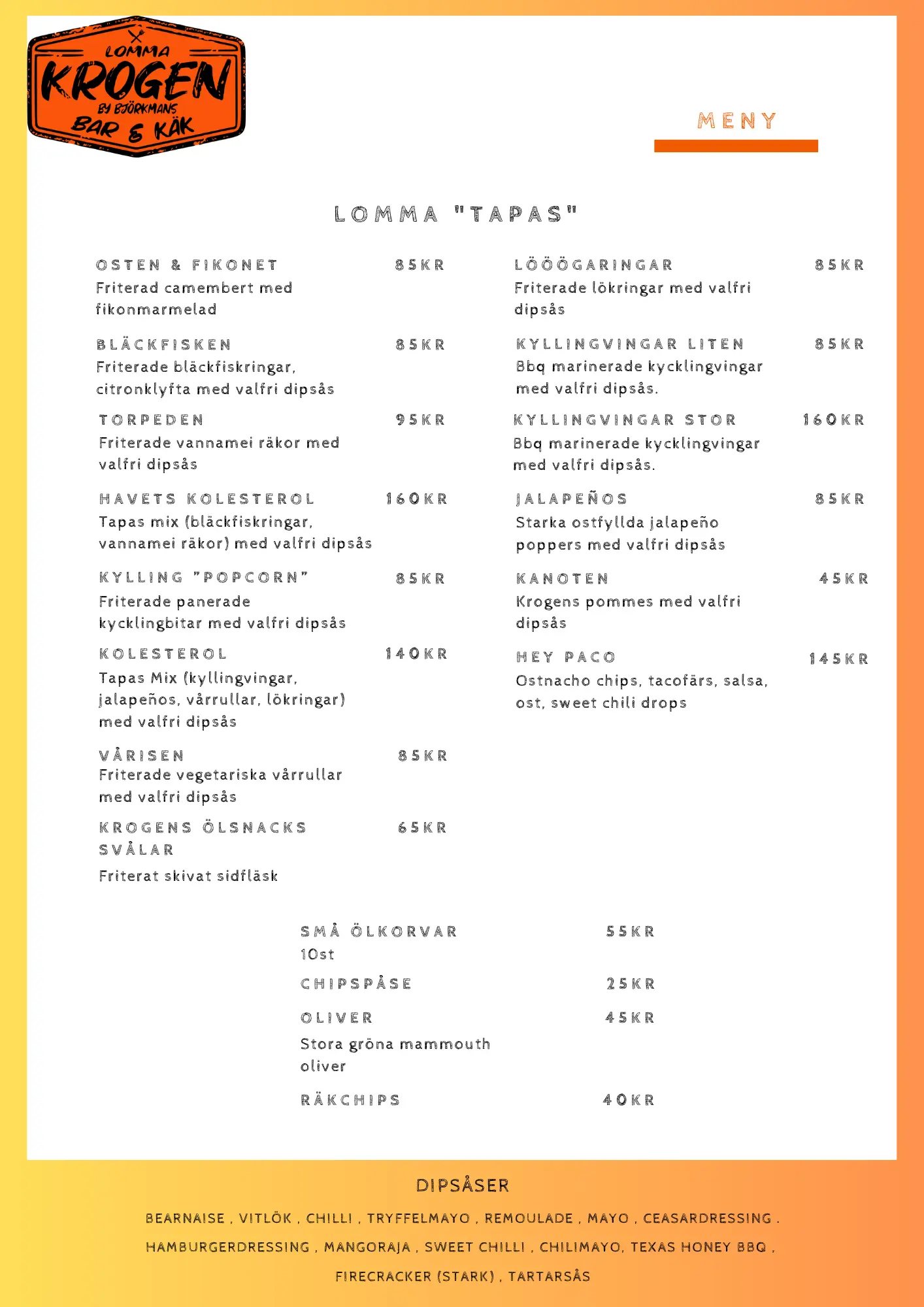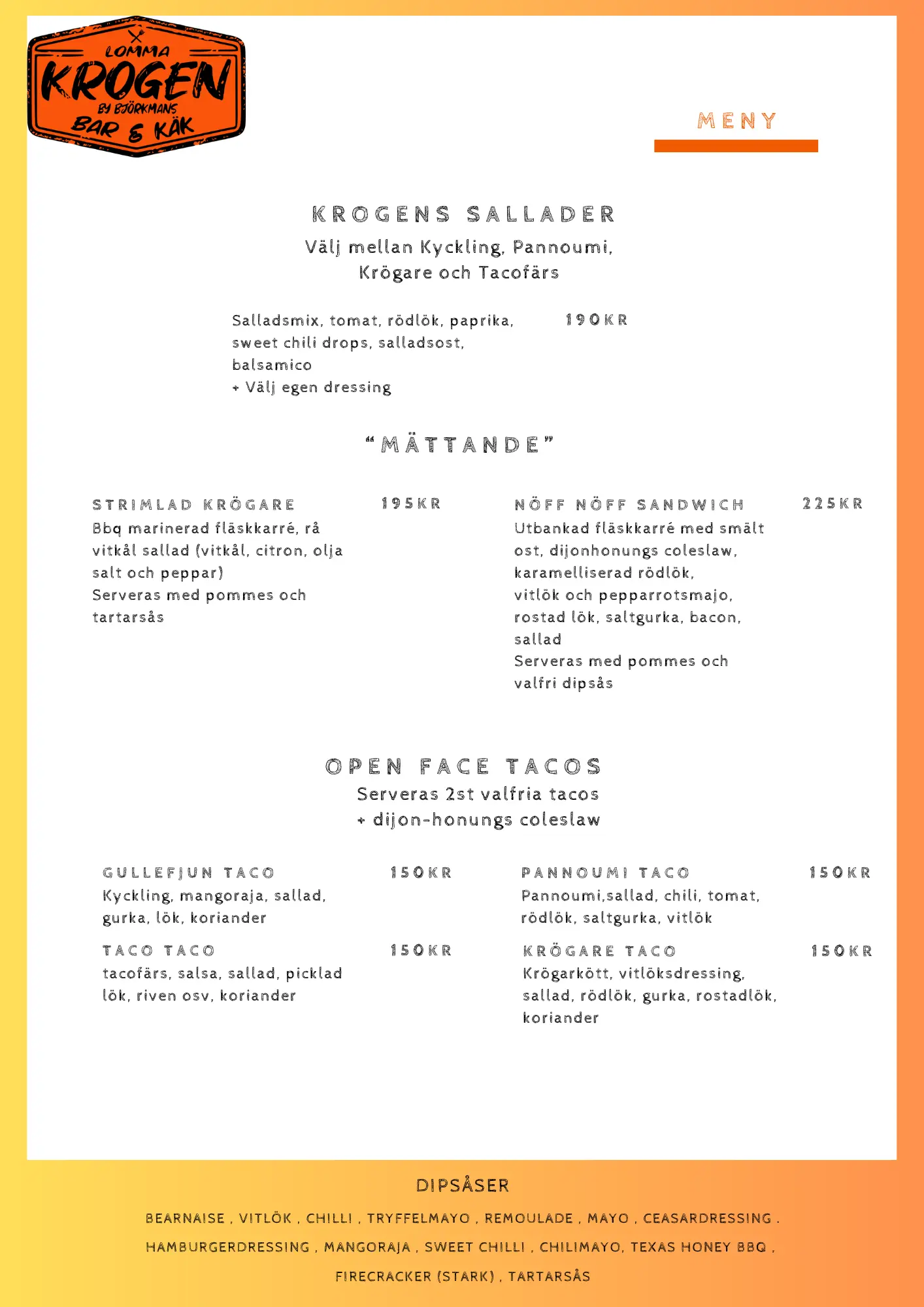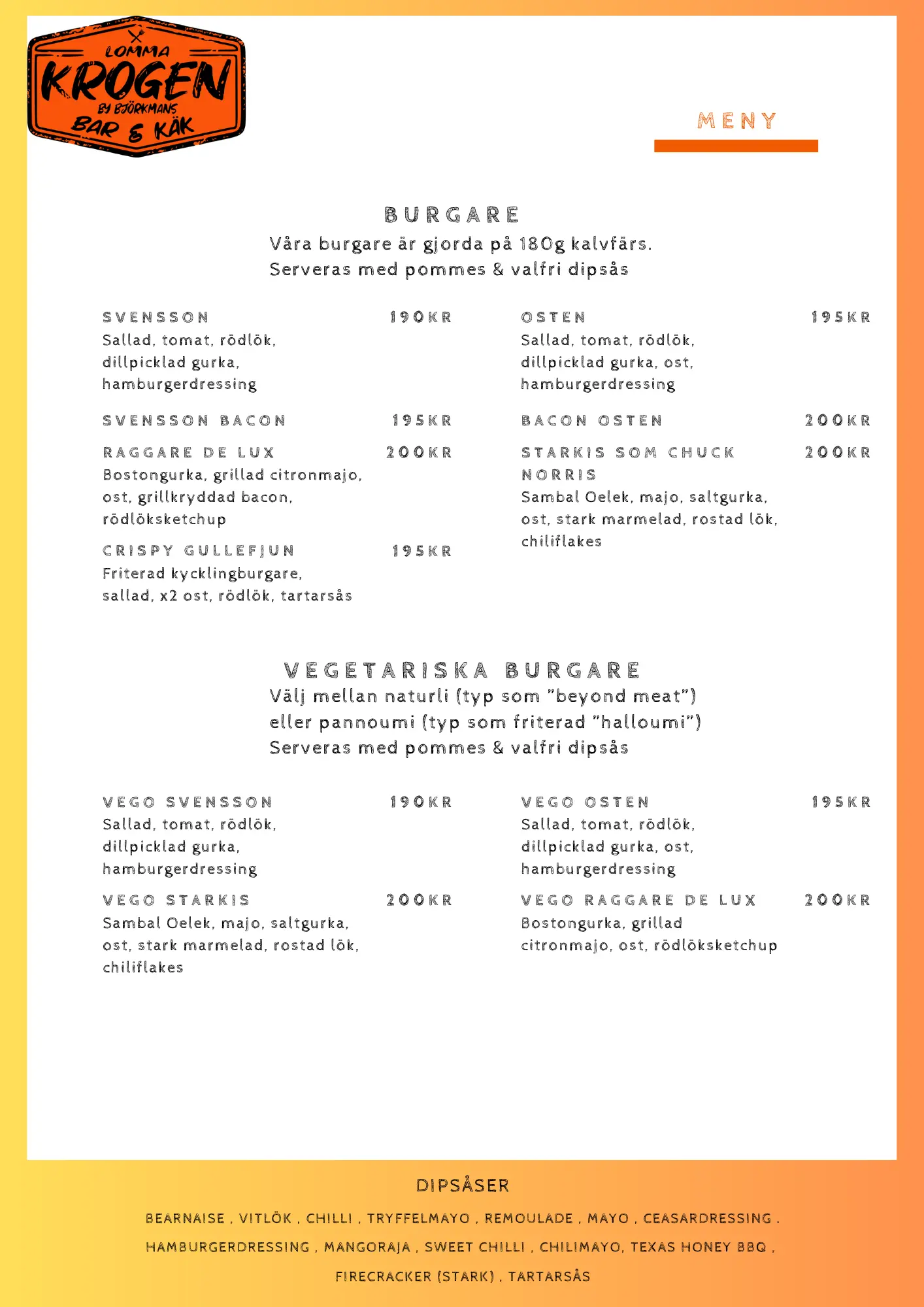 OBS: Prisskillnad finns mellan matmeny och take-away pga momsskillnad.